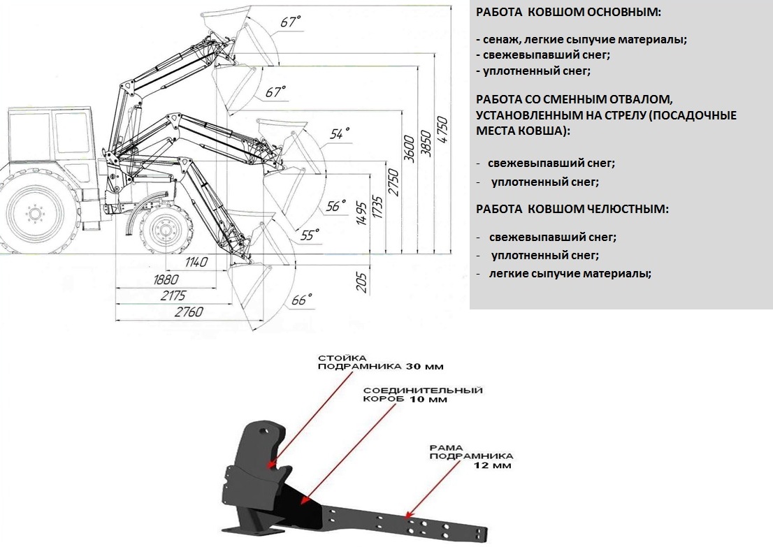- оптимальные углы выворота ковша: в верхнем положении стрелы до 67°, у земли – до 66°. Уровень ковша сохраняет положение строго параллельно земле на всей высоте подъёма;